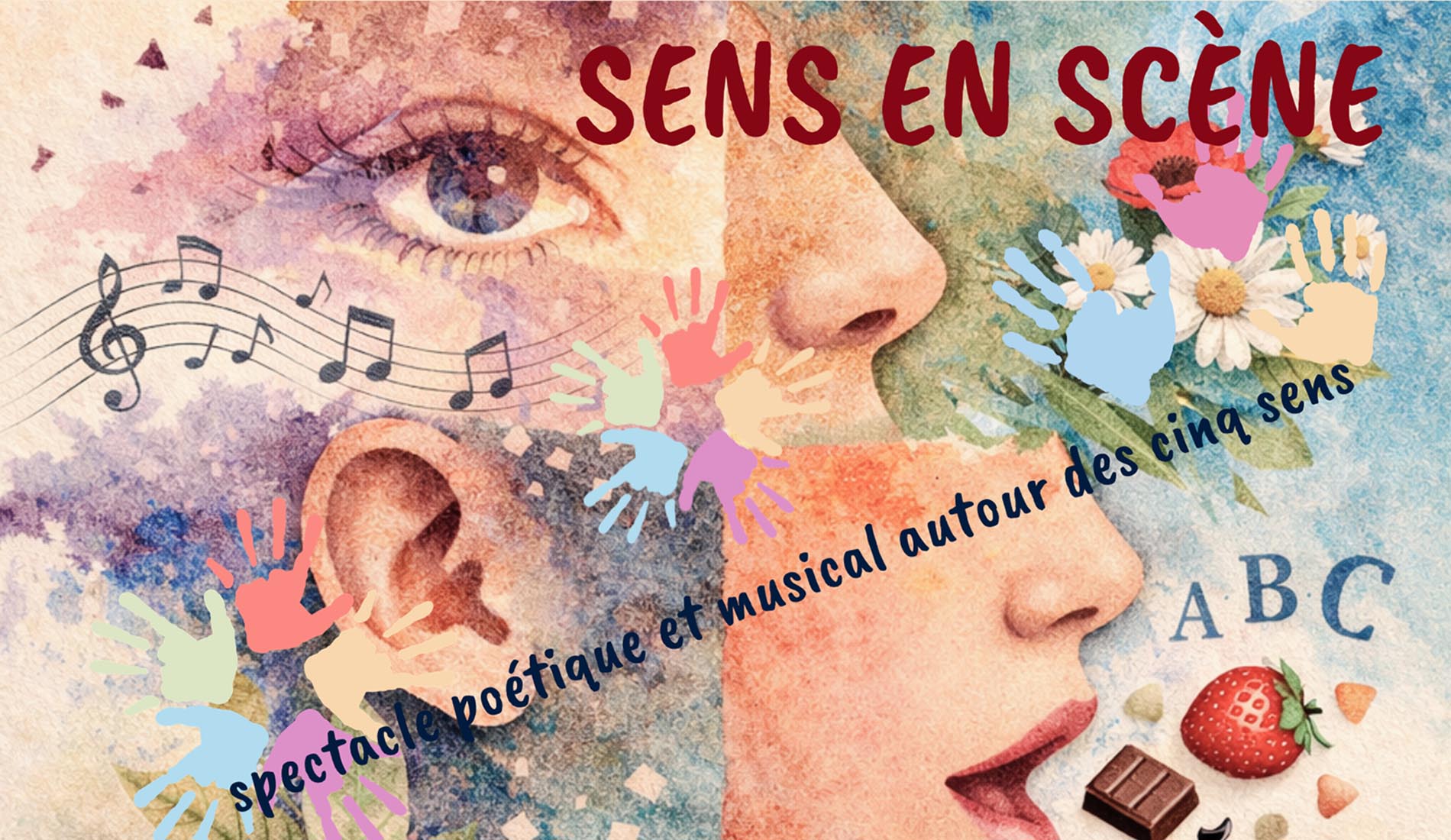 Sens en scène est un spectacle poétique et musical imaginé par la Caravane des Poètes autour des cinq sens : la vue, l’ouïe, le toucher, l’odorat et le goût. À travers une mosaïque de textes et de chansons, le public est invité à parcourir un univers sensible où les mots éveillent les perceptions et l’imaginaire.